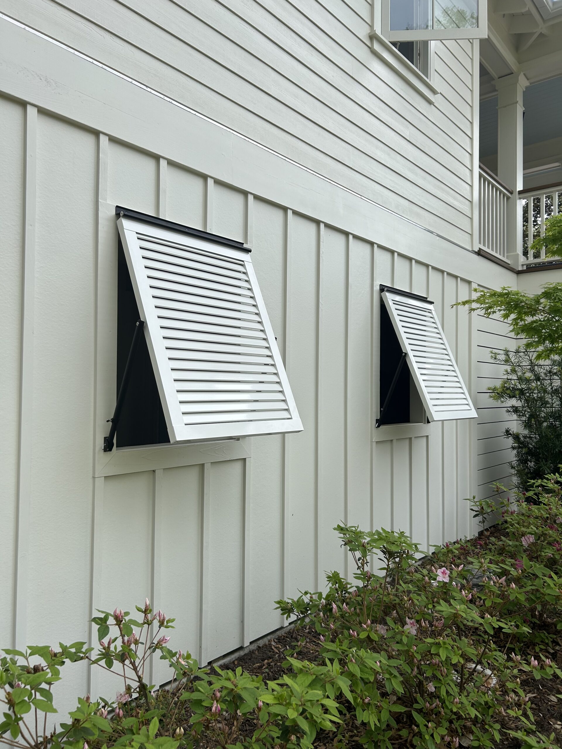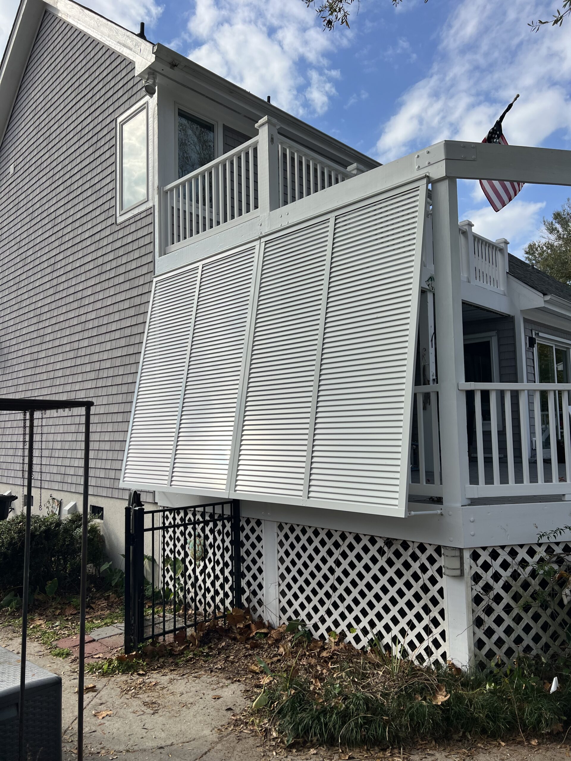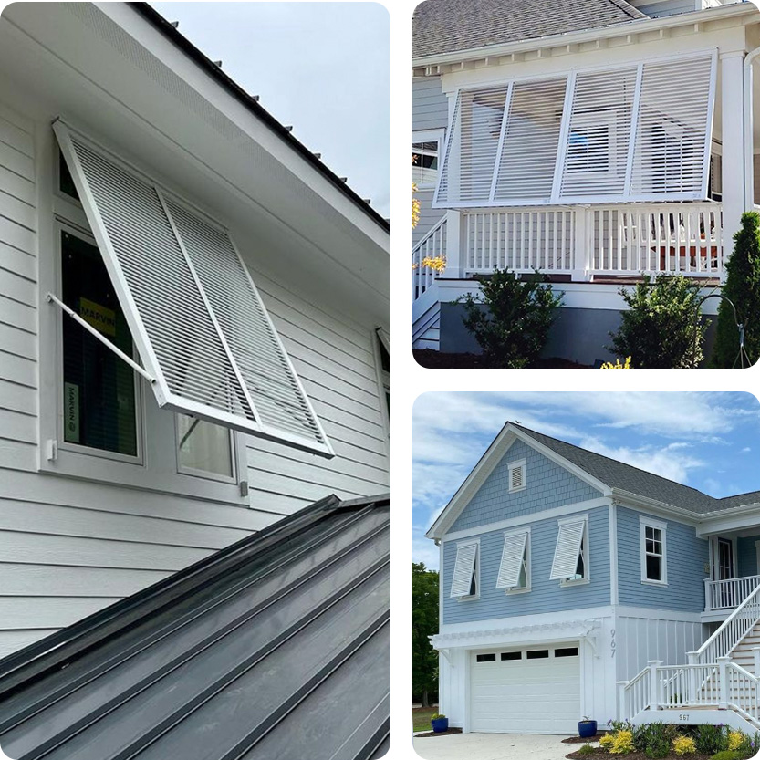 Add a coastal aesthetic to your home with iconic Bahama shutters. Bahama shutters (sometimes called Bermuda shutters), provide shade when open and an extra layer of privacy or protection when closed. Typically suspended from a hinge and designed to cover the entire window, Bahama shutters also function as shade or privacy for porches as well. Wilmington Awning aluminum shutters are available in a variety of colors and protection levels.
